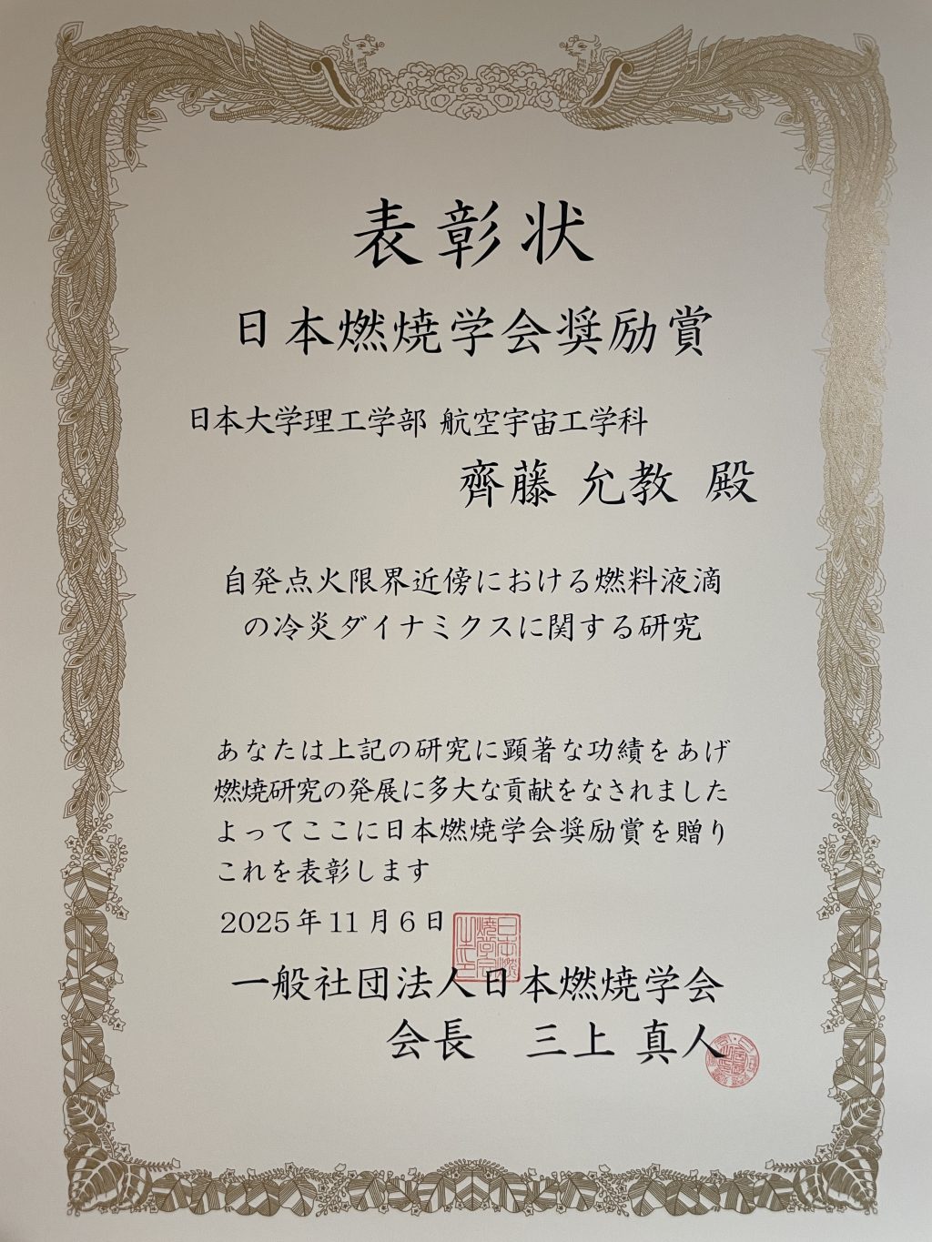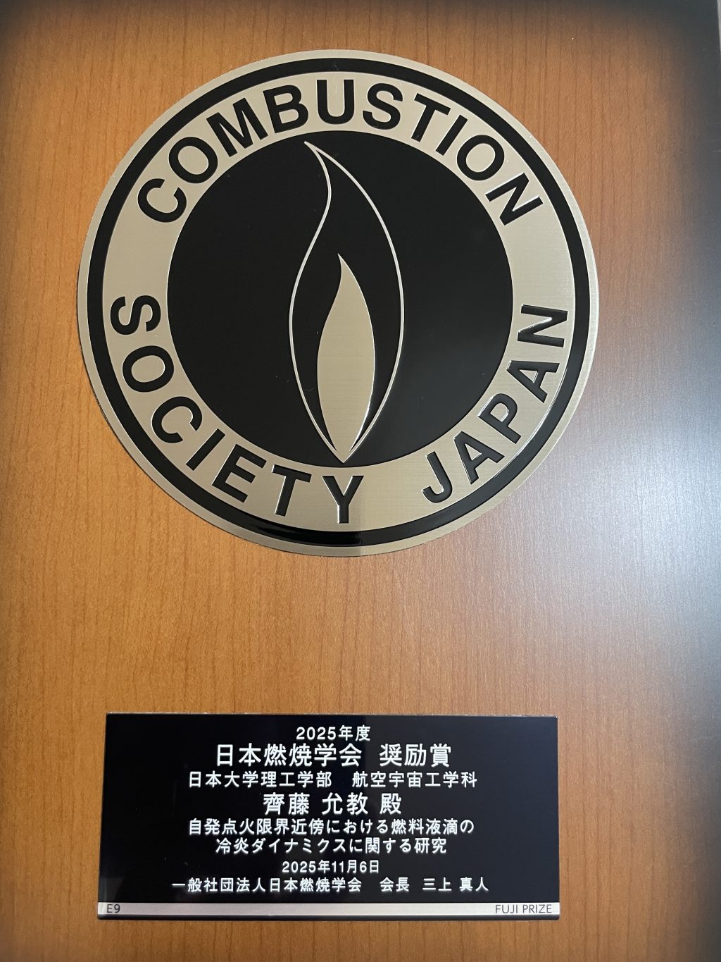 ホーム航宇からのお知らせ教員情報 齊藤允教准教授が「日本燃焼学会奨励賞」を受賞しました 2025年11月9日 持続可能航空燃料(SAF)をはじめとした炭化水素燃料から生じる冷炎に関するこれまでの研究功績が評価され,当学科の齊藤允教准教授が日本燃焼学会奨励賞を受賞しました. 受賞タイトル「自発点火近傍における燃料液滴の冷炎ダイナミクスに関する研究」 関連リンク・日本燃焼学会表彰制度について・ISASニュース(pdf記事) お知らせ一覧に戻る